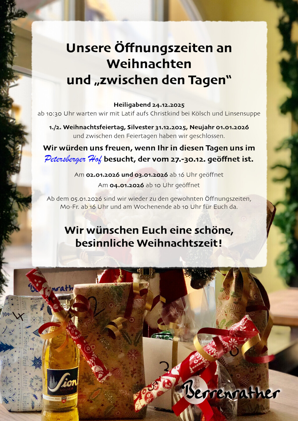Essen, Trinken und Gemütlichkeit, hat in unseren Räumlichkeiten eine lange Tradition. Seit der Erbauung des Hauses im Jahr 1911 hat sich hier immer ein gastronomischer Betrieb befunden. Diese Tradition halten wir nun seit 2005 aufrecht, als das Berrenrather in seine heutige Form, zu einer modernen Veedelskneipe umgebaut wurde. Durch die Aufnahme als nördlichster VfB-Fantreff, hat sich das Berrenrather immer mehr dem Schwäbischen verpflichtet. Mit unseren hausgemachten schwäbischen Spezialitäten, Stuttgarter Hofbräu vom Faß, ausgesuchten schwäbischen Weinen und Bränden in Kombination mit Kölscher Herzlichkeit bieten wir ein wohl einzigartiges Ambiente unter unserem Motto: